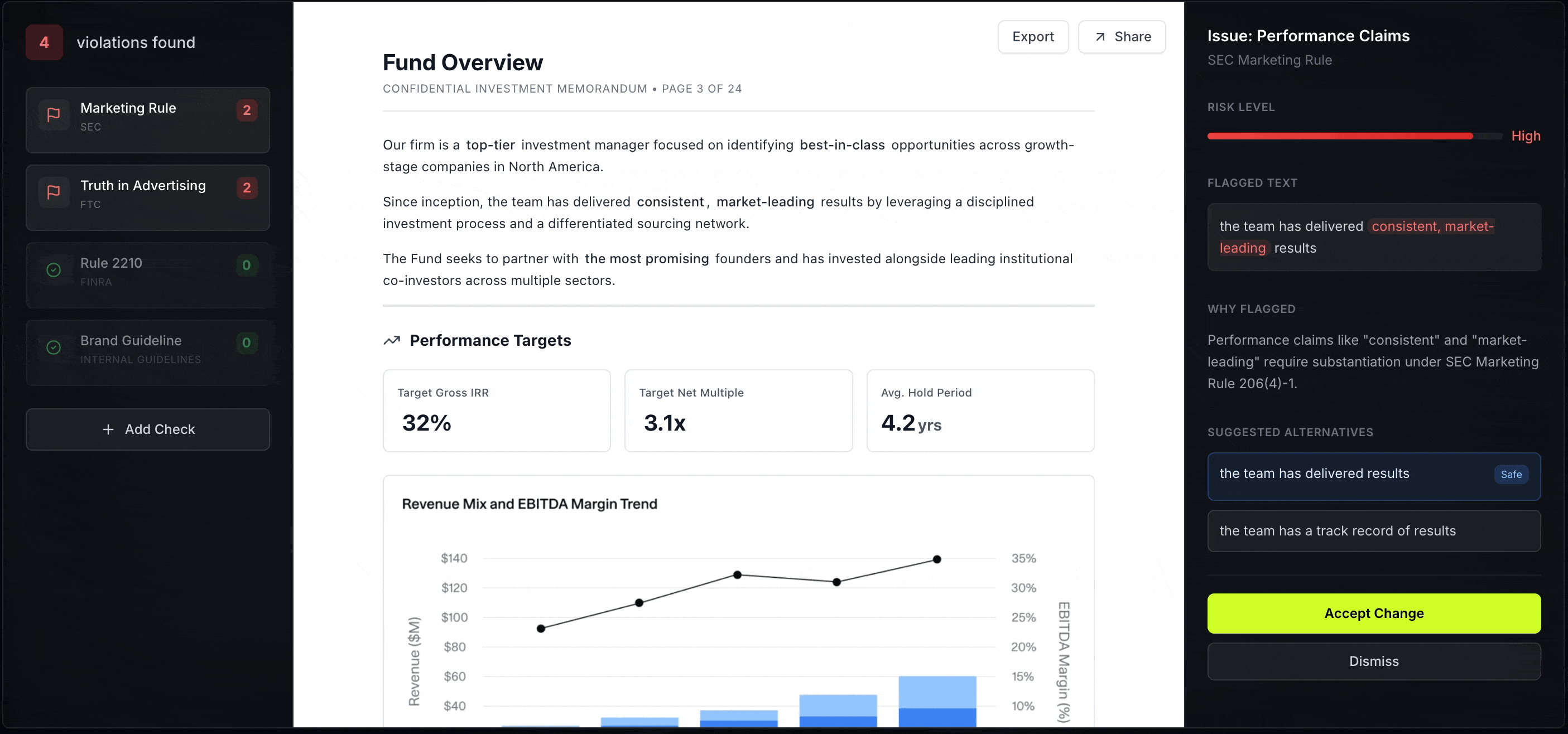 Instantly flag high-risk language, missing disclosures, and regulatory gaps so your team can publish faster with confidence.